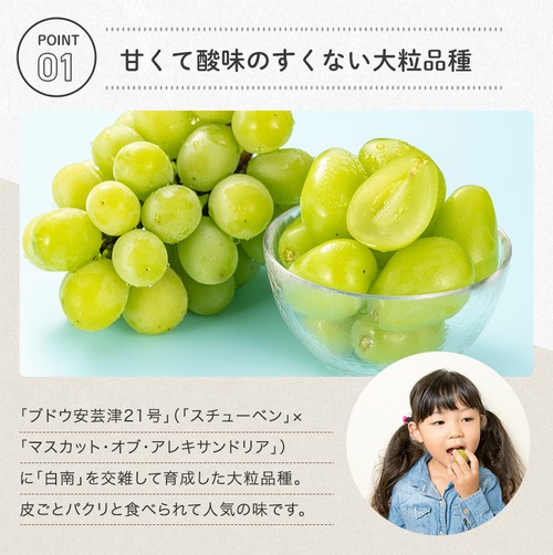 シャインマスカットの特徴は、豊かな甘さとパリっとした食感の絶妙なバランスです。朝食やおやつ、パーティーシーンにもぴったりなフルーツです。この美味しいシャインマスカットを召し上がりながら、日々の食卓を彩り豊かにしましょう!